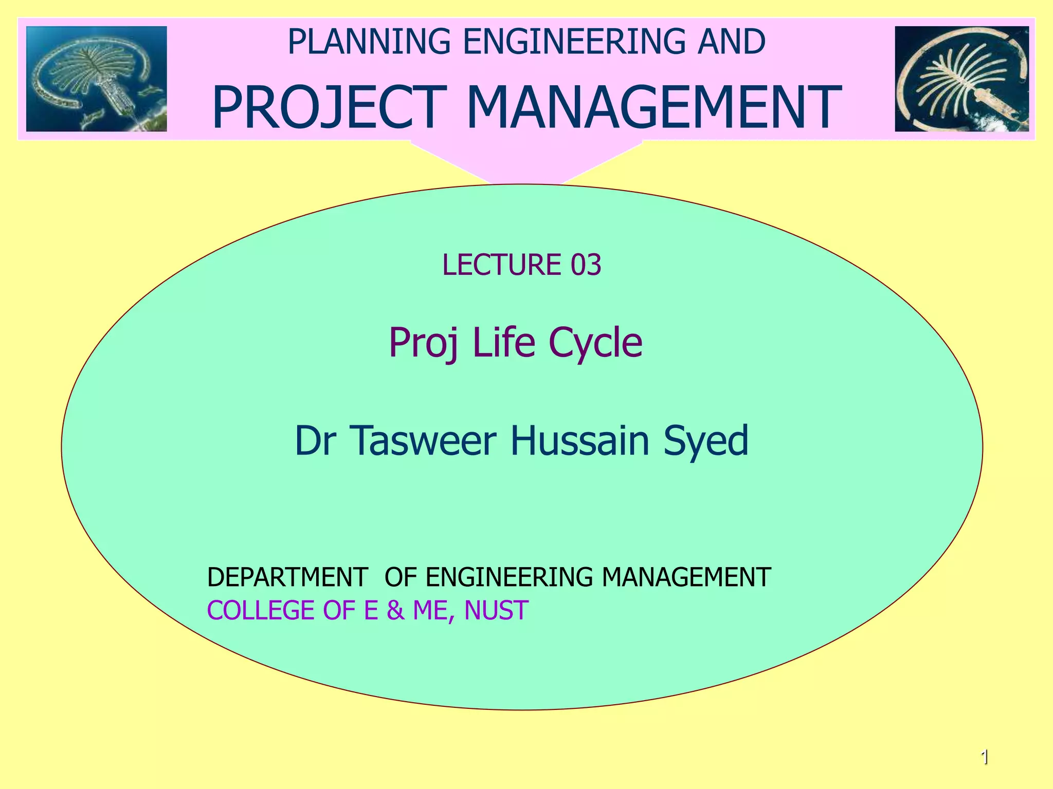 The document discusses the project life cycle and its various phases. It begins with an introduction to project management and the importance of understanding the project life cycle. It then describes the five main phases of a typical project life cycle: initiation, planning, execution, monitoring and control, and closure. For each phase, it provides an overview of the key steps and deliverables. It also discusses other important aspects that influence the project life cycle such as cost and staffing levels over time, risks, organizational structures, and interactions between project management processes.