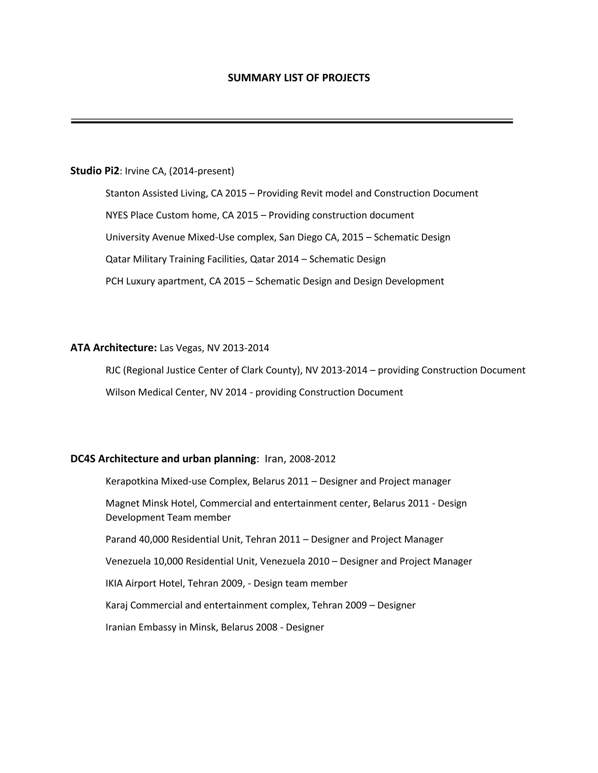 This summary list outlines various projects from three architecture firms - Studio Pi2 from 2014 to present based in Irvine, CA providing Revit models, construction documents, and schematic designs for residential and mixed-use buildings in CA and Qatar; ATA Architecture from 2013-2014 based in Las Vegas, NV providing construction documents for a regional justice center and medical center; and DC4S Architecture and urban planning from 2008-2012 based in Iran, working on residential, commercial, hotel and mixed-use projects in Iran, Belarus, Venezuela, and as a designer on an airport hotel in Tehran.