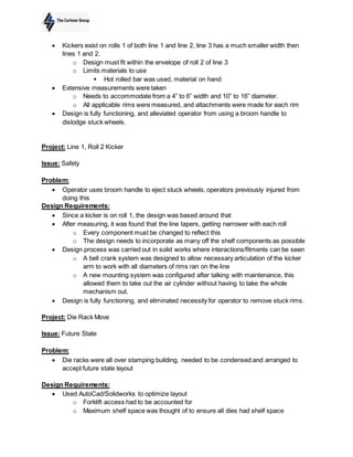The document summarizes several projects completed by the Carlstar Group engineering department to address safety issues and process improvements. Projects included designing guards to contain welding slag, kickers to remove stuck wheels from rolling lines, optimizing die rack layout, converting a press to hydraulic power, and developing a positive stop system for center presses to reduce wheel runout and eliminate an alignment step. For each project, the problem was described, design requirements were outlined addressing safety, fit, functionality and process needs, and the designed solution was summarized.