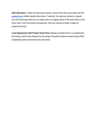 The document discusses project loans designed for project owners looking to finance new or ongoing projects, highlighting credit solutions available for various project types. It outlines key features such as capital-intensive costs, risk allocation to lenders, and loan repayment based on project cash flow. Additionally, it emphasizes the importance of maintaining a source of funds for project implementation.