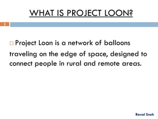Project Loon is a network of balloons traveling in the stratosphere designed to connect people in rural areas. An experimental pilot launched 30 balloons over New Zealand in 2013 to test the technology. The balloons float 20 miles above the Earth, using software to ride wind currents to positions that form a communications network. Each balloon provides internet coverage to an area of about 40 square kilometers using solar power and bouncing signals between balloons. The goal is to increase internet access for remote areas around the world.