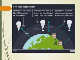 Project Loon is a network of balloons traveling in the stratosphere designed by Google to provide internet access to rural and remote areas. The balloons float twice as high as airplanes and are moved around the globe by wind currents. Special antennas on buildings allow people to connect to the balloon network. Each balloon uses GPS and software algorithms to navigate wind patterns and position itself within the network to provide internet coverage. Project Loon aims to give 3G-level internet access to the two-thirds of the world currently without reliable connectivity and help reconnect people after natural disasters.