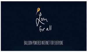 Project Loon is a network of balloons traveling in the stratosphere that is designed to connect people in rural and remote areas. The project started with an experimental pilot test in 2013 in New Zealand using 30 balloons launched from the South Island. The balloons float in the stratosphere using winds to move in desired directions and form a communications network. People on the ground connect to the balloon network using special antennas. The signal bounces between balloons and then to the global internet. The balloons are powered by solar panels and designed to last for a few weeks before needing to be replaced.