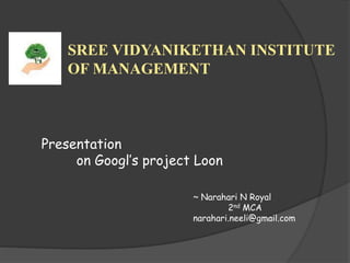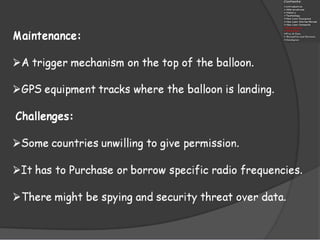 Project Loon is a Google project that aims to provide internet access to rural and remote areas using high-altitude balloons. The balloons travel in the stratosphere and work together to beam internet connectivity down to earth. They are designed with plastic envelopes, solar panels, electronics, and communication equipment. Loon uses wind data to determine balloon movements across the globe to provide coverage. It has the potential to provide affordable internet access to many without existing infrastructure, but faces challenges in speed, hardware failures, and limited balloon lifespan. Overall comments on Loon have been mostly positive for helping connect people in hard to reach areas.