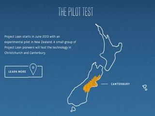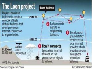 Google's Project Loon aims to provide internet access to rural and remote areas using a network of high-altitude balloons that can achieve speeds comparable to 3G. Launched in 2013, the project utilizes solar-powered balloons that float in the stratosphere and can be steered by adjusting their altitude to ride winds in the desired direction. While it offers advantages like ease of use and increased internet access, there are challenges such as cost and maintenance, as balloons can only operate for a limited time.