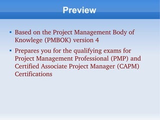 The document provides an overview of project management concepts including defining a project, the role of a project manager, and the Project Management Body of Knowledge (PMBOK). A project is a temporary endeavor to create a unique product or service. Project management involves coordinating resources to meet objectives for a project. The PMBOK defines the generally recognized practices and processes involved in project management.