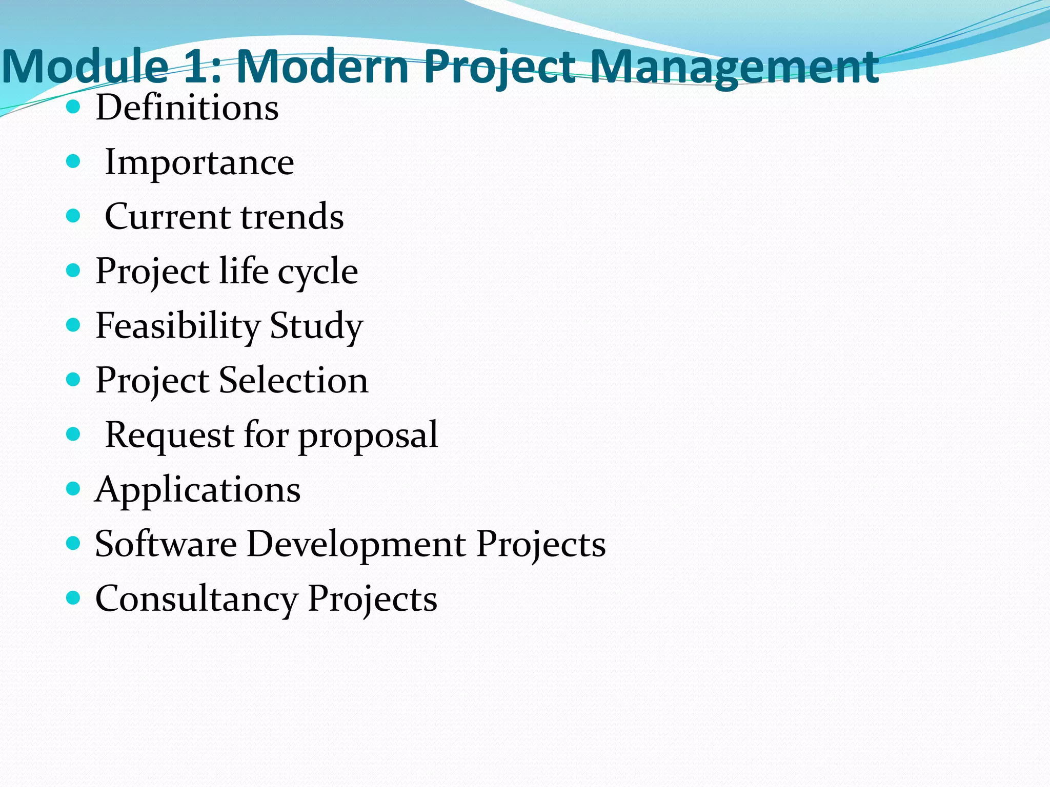 This document provides an overview of modern project management. It defines a project, lists common project characteristics, and gives examples. It also outlines the key stages of the project life cycle: defining, planning, executing, and delivering. Additionally, it discusses the importance of project management, current trends in the field, and covers topics like feasibility studies, project selection, and software/consultancy projects. The document provides definitions and steps for conducting a feasibility study to assess the viability of a proposed project.