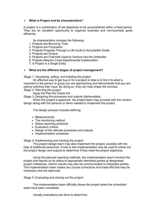 A project is a temporary endeavor undertaken to create a unique product or service. It has defined start and end dates, objectives to be met, and resources allocated. There are typically five stages of project management: 1) initiating and visualizing the project, 2) planning the project, 3) designing processes and deliverables, 4) implementing and tracking the project, and 5) evaluating and closing out the project. Common reasons for project failure include poor planning, lack of leadership, inadequate stakeholder engagement, insufficient budgeting, and scope creep. Proper execution of a project involves managing the team and scope, recommending changes, communicating with stakeholders, celebrating milestones, and documenting changes.