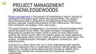 Knowledgewoods project management involves overseeing a team's activities to meet project goals within budget, time, and scope constraints. The primary objective is to deliver a product that aligns with client goals, often requiring adjustments to the client's initial brief. Projects are unique, time-limited endeavors aimed at achieving specific outcomes and creating positive change.