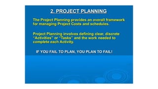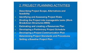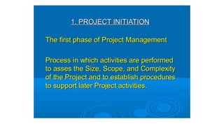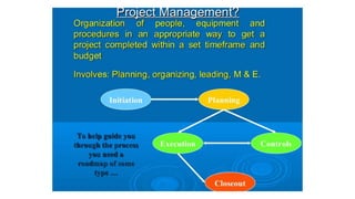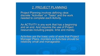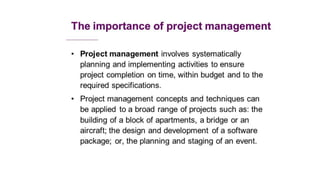 A project is a temporary endeavor with defined start and end dates undertaken to create a unique product or service. It involves a set of interdependent tasks aimed at achieving a common goal within certain constraints like time, budget, and quality. Projects vary in size, duration, resources required, and complexity. Project management techniques help plan, execute, monitor, and close projects successfully.