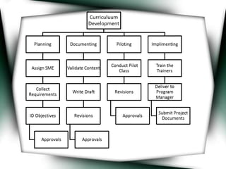 The document outlines the project management process for developing curriculum. It discusses the importance of project management for efficiently completing projects and achieving organizational objectives. The process involves planning, documenting, piloting, and implementing the new curriculum. Key steps in the planning phase include identifying stakeholders, creating a project charter, developing a work breakdown structure and schedule. The documenting phase involves drafting lesson plans, materials, and getting approvals. Piloting involves testing the new curriculum with a sample group and evaluating effectiveness. Upon approval, the curriculum is then implemented organization-wide.