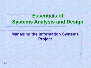 This document discusses project management of information systems projects. It describes the project management process, which includes planning, analysis, development, and implementation phases. During the analysis phase, tasks are identified and scheduled using techniques like Gantt charts and network diagrams to manage dependencies. The document provides an example of creating a Gantt chart and network diagram for a project at Pine Valley Furniture Manufacturing Company to design a new database system. Commercial project management software can be used to establish the project schedule and tasks.