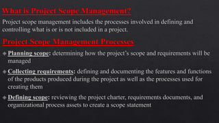 The document discusses the planning and scope of enterprise projects, distinguishing between project scope and product scope, with a focus on project management methodologies. It outlines various types of projects, including industrial, manufacturing, and management projects, highlighting the unique challenges and requirements associated with each. Additionally, it emphasizes the importance of effective project management and the generation and screening of project ideas based on market demand and feasibility.