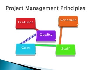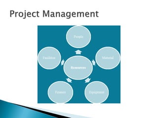 This document provides an overview of project management concepts including definitions of key terms, the project life cycle, tools and techniques used in project management, and components involved in planning, executing, monitoring, and closing projects. It discusses aspects of project management such as time, cost, quality management, risk management, and stakeholder management. The document also covers topics like project feasibility, scheduling, estimation, and control.