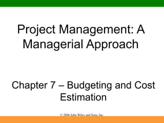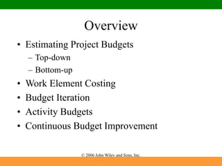 This document discusses budgeting and cost estimation in project management, outlining two main methods: top-down and bottom-up budgeting, each with distinct advantages. It emphasizes the importance of accurately estimating resource needs and the iterative nature of the budgeting process to align actual and projected costs. The text also explores various budgeting strategies, common sources of estimation errors, and the reasons firms may fund non-profitable projects.