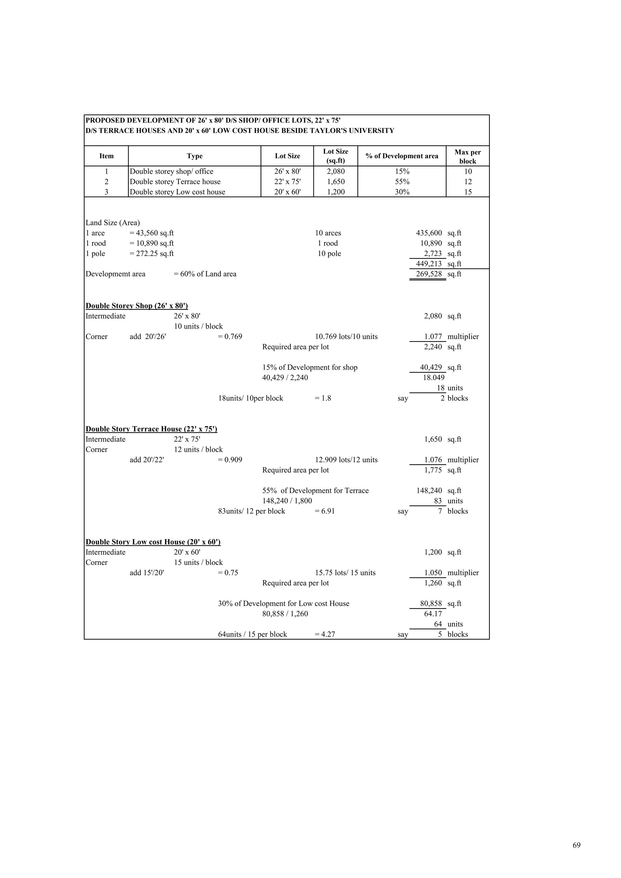 The document proposes developing 26' x 80' double-storey shop/office lots, 22' x 75' double-storey terrace houses, and 20' x 60' low-cost houses on a 10-acre land beside Taylor's University. It includes details of the proposed development such as the number and size of units, land size calculations, percentage allocation for each type of development, and a financial appraisal of the development costs and projected profits. The development is estimated to cost RM38.2 million and projected to generate a gross profit of RM16.3 million, representing a 30% return on the RM54.5 million estimated gross development value.