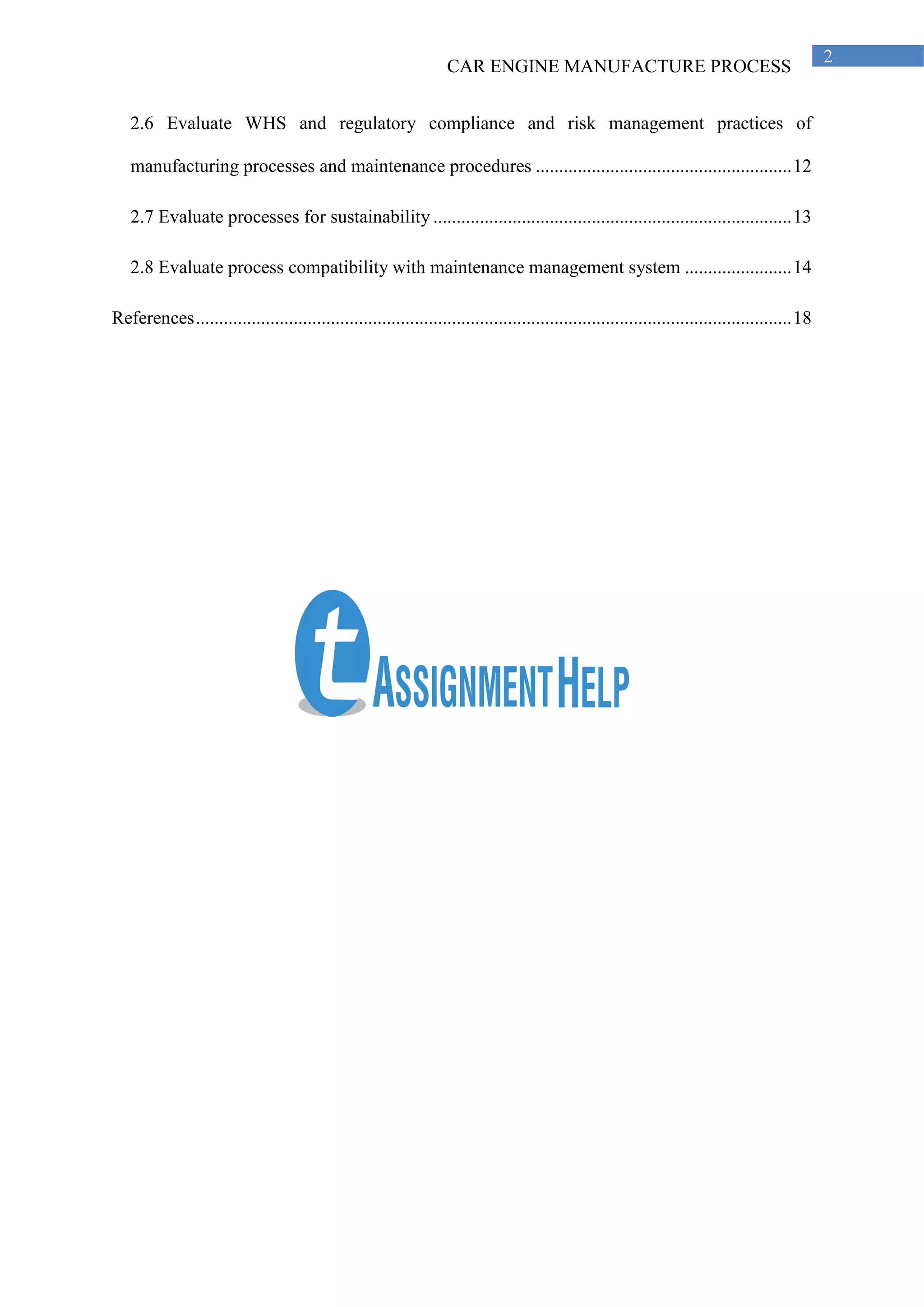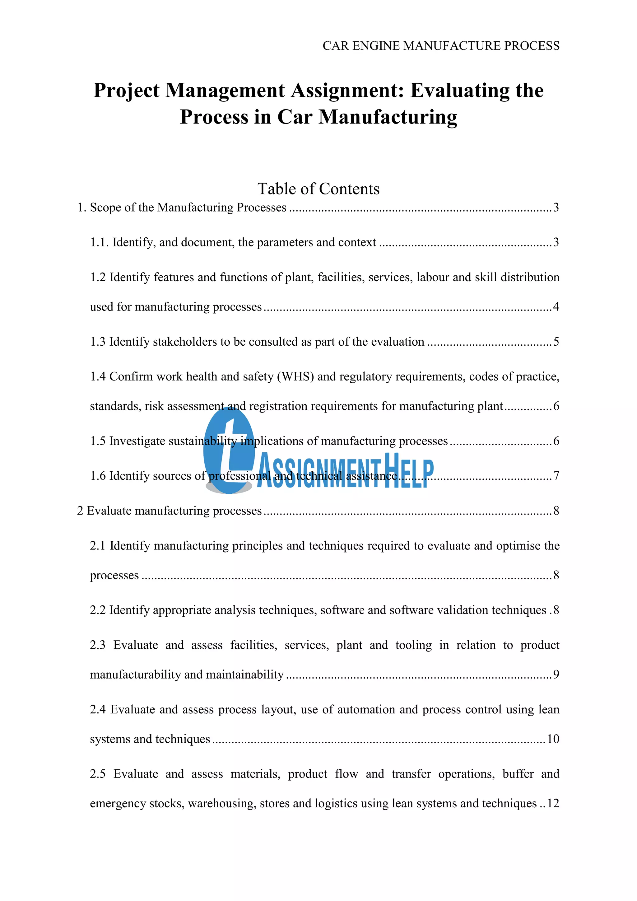 This document outlines the project management process for evaluating car engine manufacturing, emphasizing parameters such as health and safety, sustainability, and stakeholder involvement. It discusses the use of lean manufacturing principles, advanced technologies, and compliance with regulatory standards to optimize production, ensure quality, and mitigate environmental impacts. The assessment covers materials, processes, and maintenance practices to enhance manufacturability and maintainability in engine production.