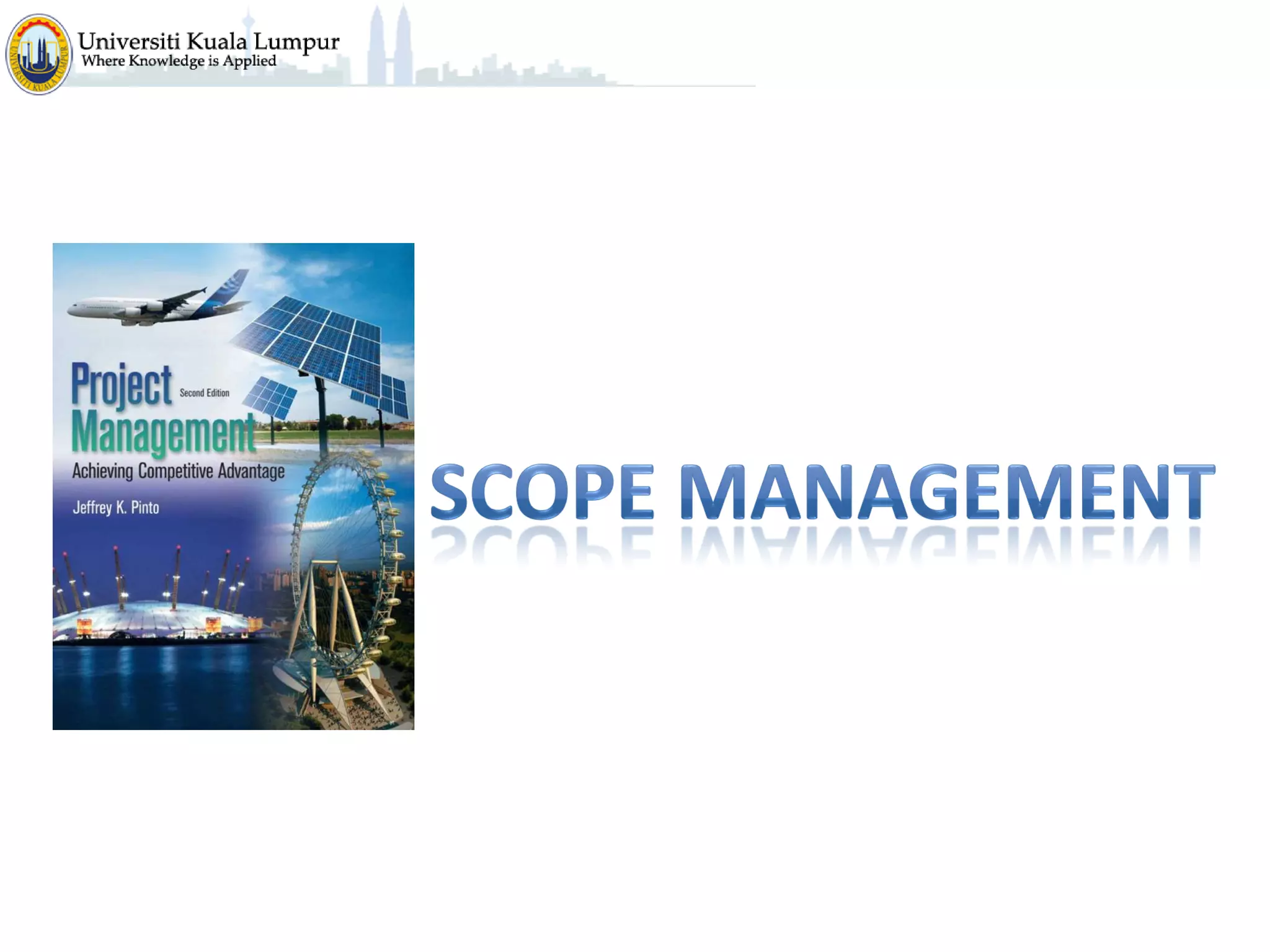 The document discusses project scope and scope management. It defines project scope as including all the work content and expected outcomes of a project. Scope management involves controlling the project goals, objectives, and consists of conceptual development, scope statement, work authorization, scope reporting, control systems, and project closeout. It provides details on each of these components, including defining problem statements, work breakdown structures, organizational breakdown structures, responsibility assignment matrices, and different types of contracts and control systems used in scope management.