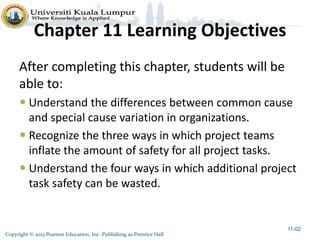 This chapter discusses critical chain project scheduling and the theory of constraints. It explains how critical chain methodology addresses issues like variation, resource conflicts, and wasted safety margins that can cause delays. Key aspects covered include identifying the constraint or bottleneck, exploiting it by prioritizing projects, inserting buffers, and resolving conflicts to maximize throughput within the constraints. The chapter also reviews critiques of critical chain project management.