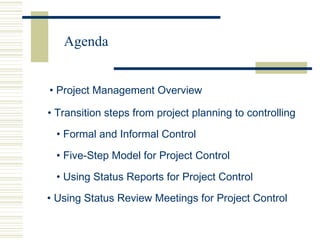 This document discusses project management control. It outlines the transition from project planning to controlling, including validating plans, obtaining sign-offs, and reselling project management benefits. Formal control methods include status reports and review meetings. A five-step model for project control is presented: update status, analyze variances, act on problems, publish revisions, and inform management. Status reports should contain progress, forecasts, budgets, risks, and recognitions. Review meetings address unmet milestones and corrective actions.