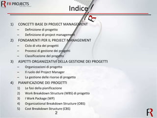 Il documento analizza le basi del project management, fornendo definizioni, processi e metodologie per gestire progetti in modo efficace. Viene descritto il ciclo di vita di un progetto, le fasi di pianificazione, classificazione dei progetti e l'organizzazione del team. Infine, si presentano strumenti come WBS, CBS e Gantt per facilitare la gestione dei progetti.