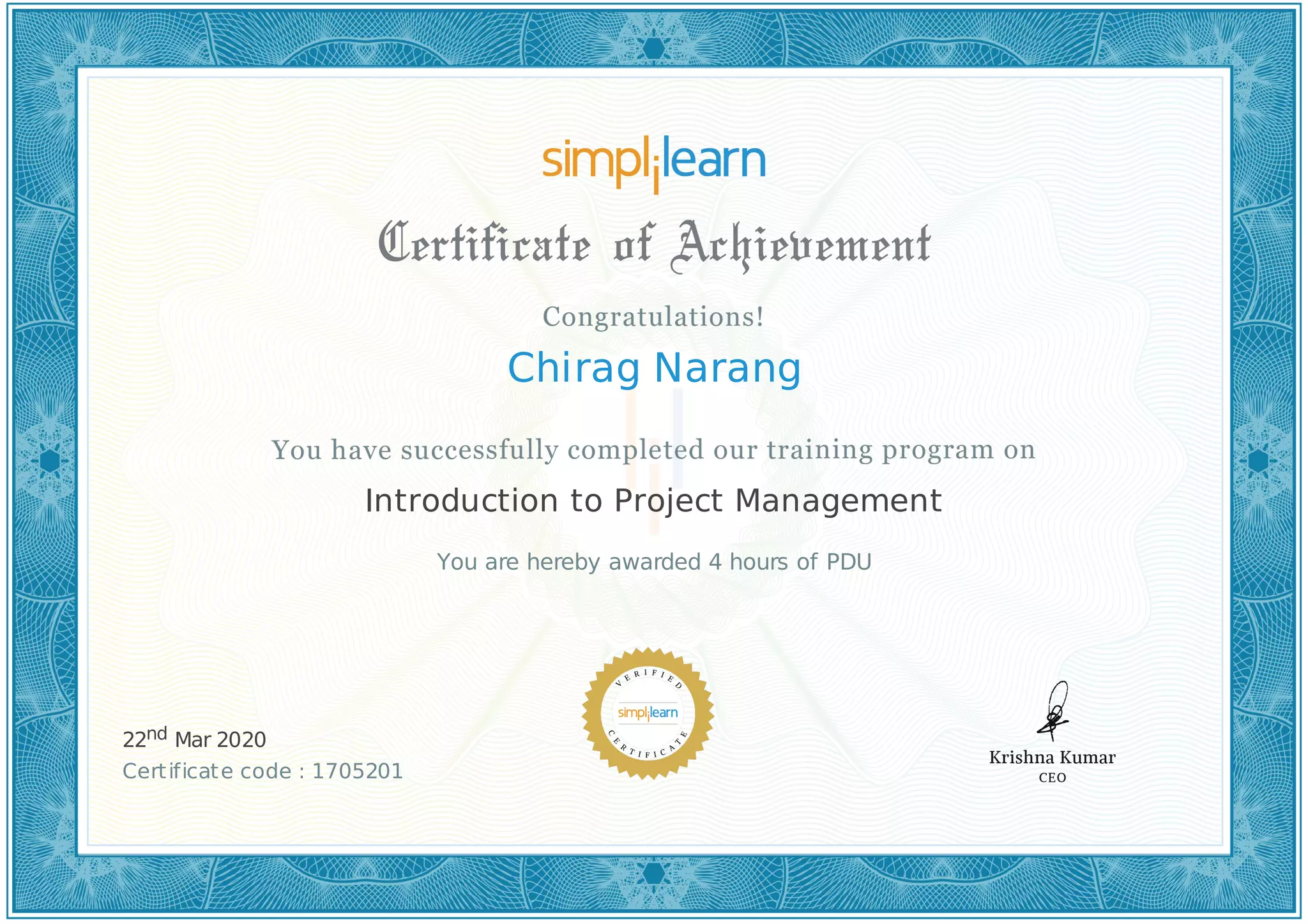 This certificate awards Chirag Narang with 4 hours of professional development units for completing an introduction to project management course on March 22nd, 2020. The certificate code for Chirag's completion is 1705201.