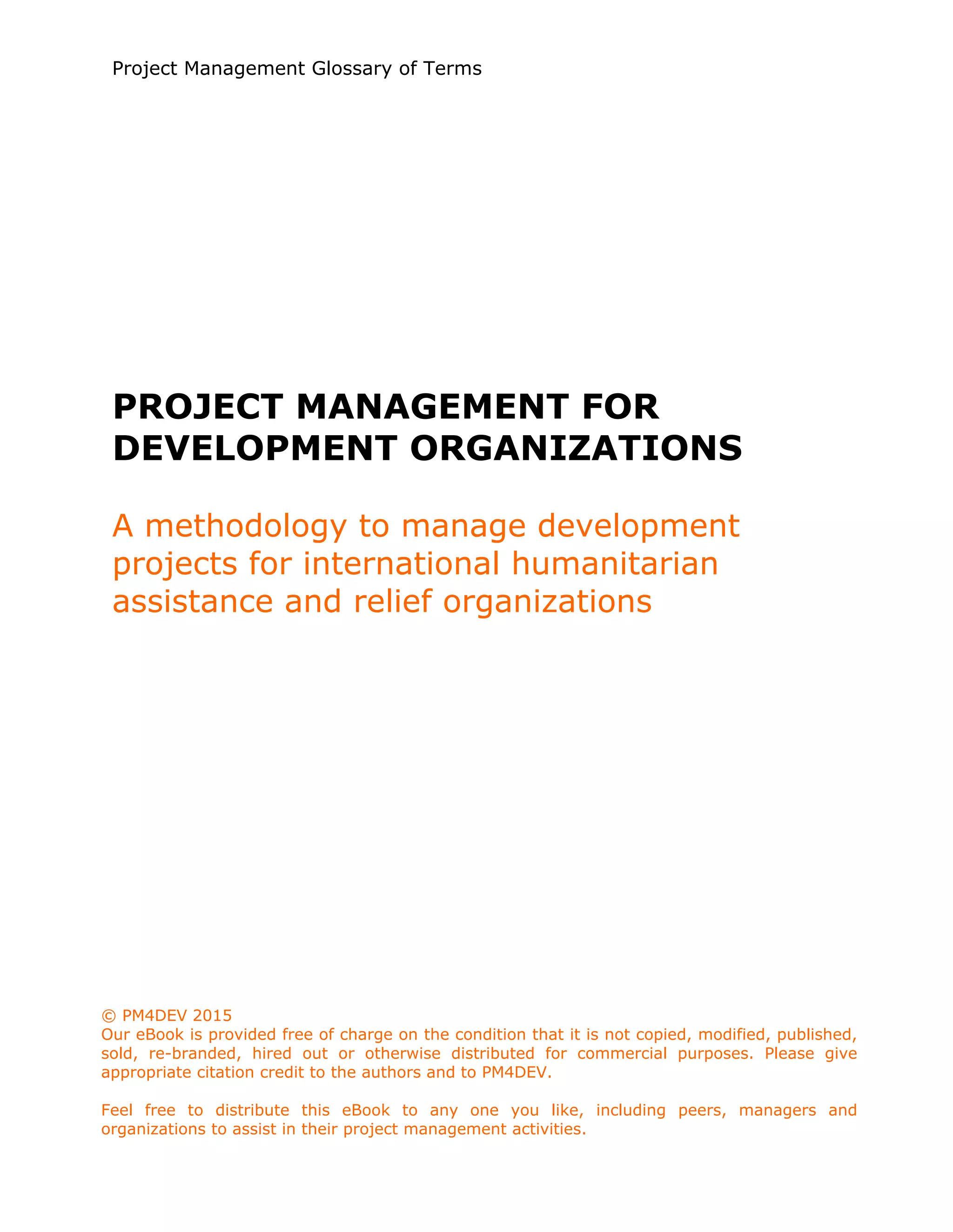 This document provides definitions for over 50 terms related to project management. It defines key terms like project, activity, budget, baseline, change control, communication, contingency, critical path, deliverable, dependency, and detailed implementation plan. The definitions are concise explanations of the meaning of each term in the context of project management. The document is intended to serve as a glossary of terms for project management.