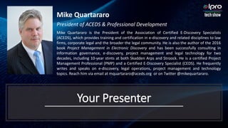 The document outlines the principles of project management as applied to electronic discovery (e-discovery), emphasizing the integration of structured skills and methodologies to efficiently manage legal projects. Presenter Mike Quartararo, an expert in the field, highlights the importance of defining processes, managing scope, time, and costs, and utilizes a project management framework consisting of five process groups and ten knowledge areas. Key concepts include the role of project managers, the project lifecycle, and the application of work breakdown structures to enhance project effectiveness in legal settings.