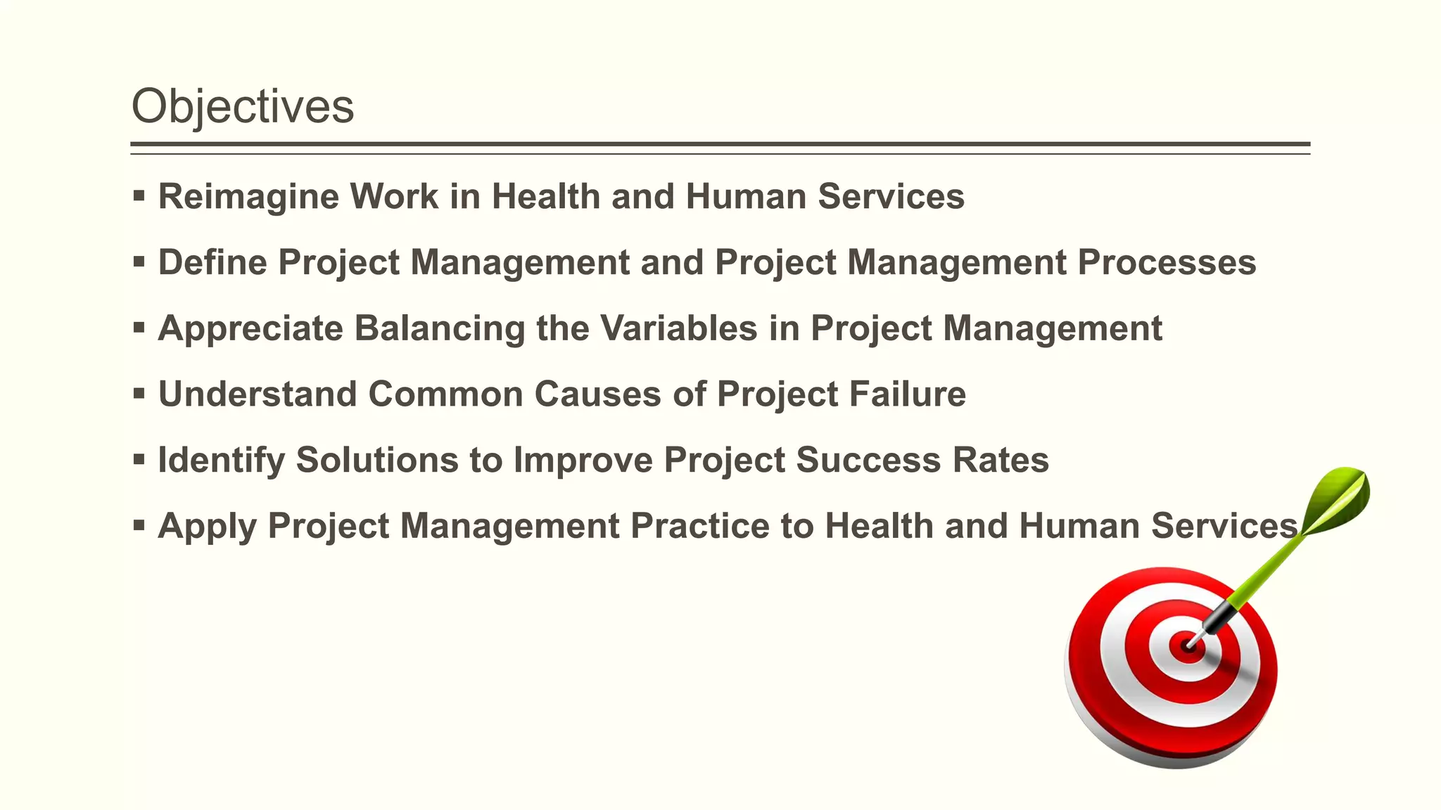 The document outlines the principles and practices of project management specifically tailored for health and human services. It addresses the importance of defining project objectives, the management processes involved, common causes of project failure, and best practices for successful project execution. Additionally, it includes a case study on developing a training program for mental health providers using DSM-5 diagnostic codes, detailing project planning, execution, monitoring, and closing phases.
