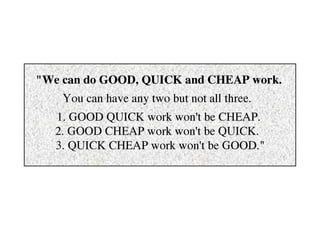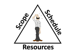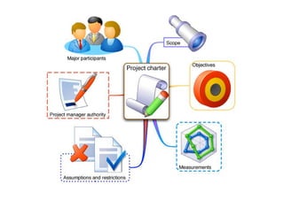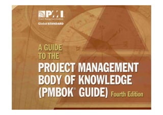 The document discusses project management according to the Project Management Institute (PMI). It defines a project as a temporary endeavor with a defined beginning and end, undertaken to create a unique product or service. A project is considered large by PMI if it involves over 200 people, lasts longer than one year, or costs more than $1 million. The document also defines a program as a group of related projects managed in a coordinated way. It outlines some key constraints in project management like time, cost, scope, quality and resources. It then describes the five phases of the project management process - initiating, planning, executing, monitoring and controlling, and closing.