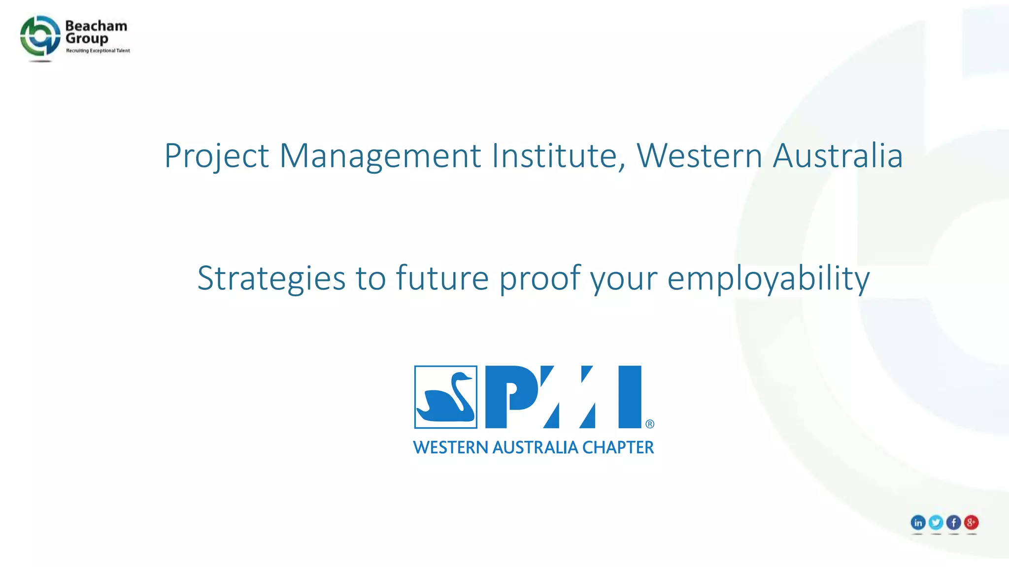 This document provides strategies for future-proofing one's employability. It discusses trends to focus on what you can control like your skills and network. The big future trends include an aging population, technology disruption, energy, education, and financial technology. It emphasizes building a sustainable career by becoming an in-demand employee, focusing on career over jobs, lifelong learning, and teamwork. It provides tips for personal branding, networking, developing relationships with recruiters, and staying up to date by reading reports on future workforce trends from sources like CEDA, ABS, and Deloitte.