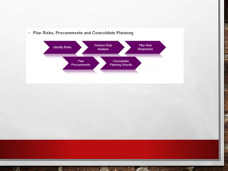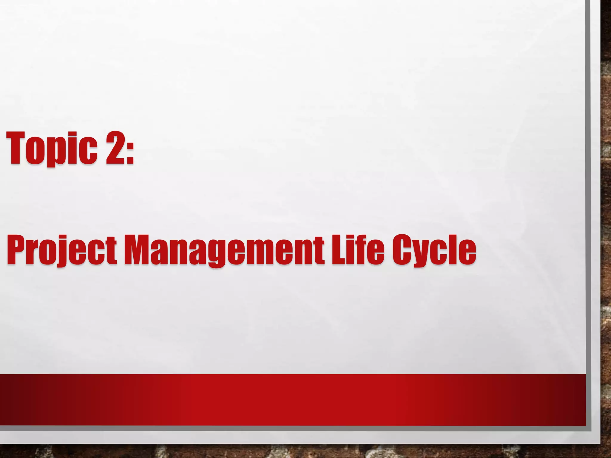 The document discusses the project management life cycle which includes 5 process groups: initiating, planning, executing, monitoring and controlling, and closing. It also discusses the 10 knowledge areas that are core to project management according to PMI. The process groups involve defining a project, planning how to execute it, carrying out the work, tracking progress, and finally closing the project. The knowledge areas provide the technical skills needed for effective project management.