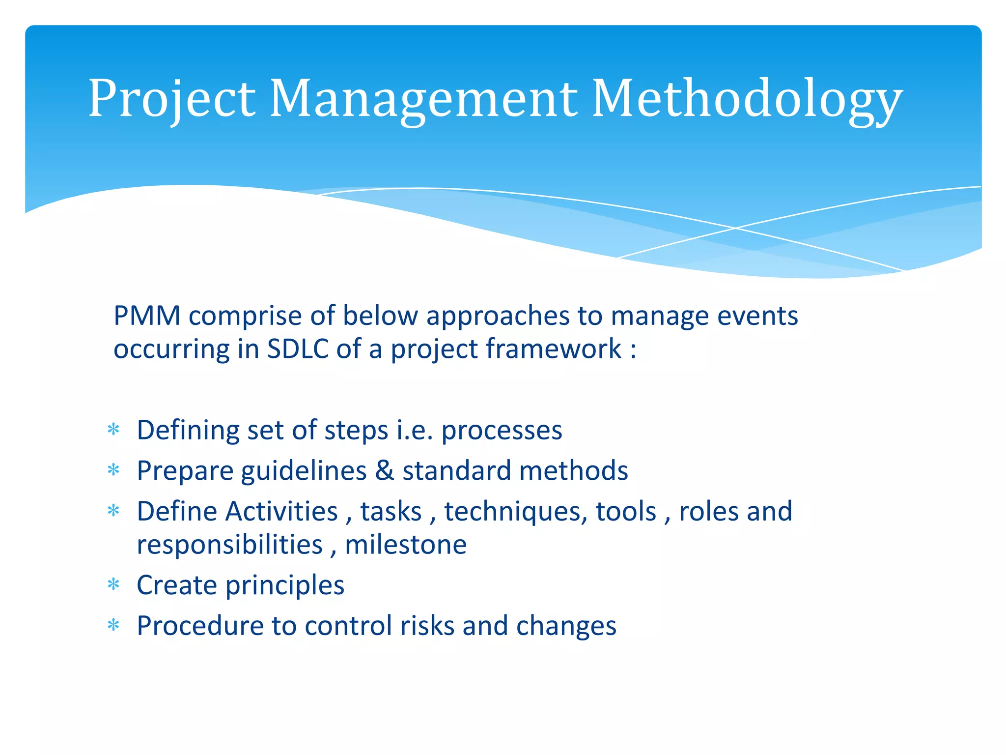 The document discusses various project management methodologies. It describes key components of project management methodologies including defining processes, guidelines, activities, tasks, roles and responsibilities. Some common activities across methodologies are project scheduling, cost and resource planning, risk management, quality assurance, and communication planning. Benefits of using project management methodologies include better processes, flexibility, focus on quality, managing complexity, consistency, and guidance for teams.