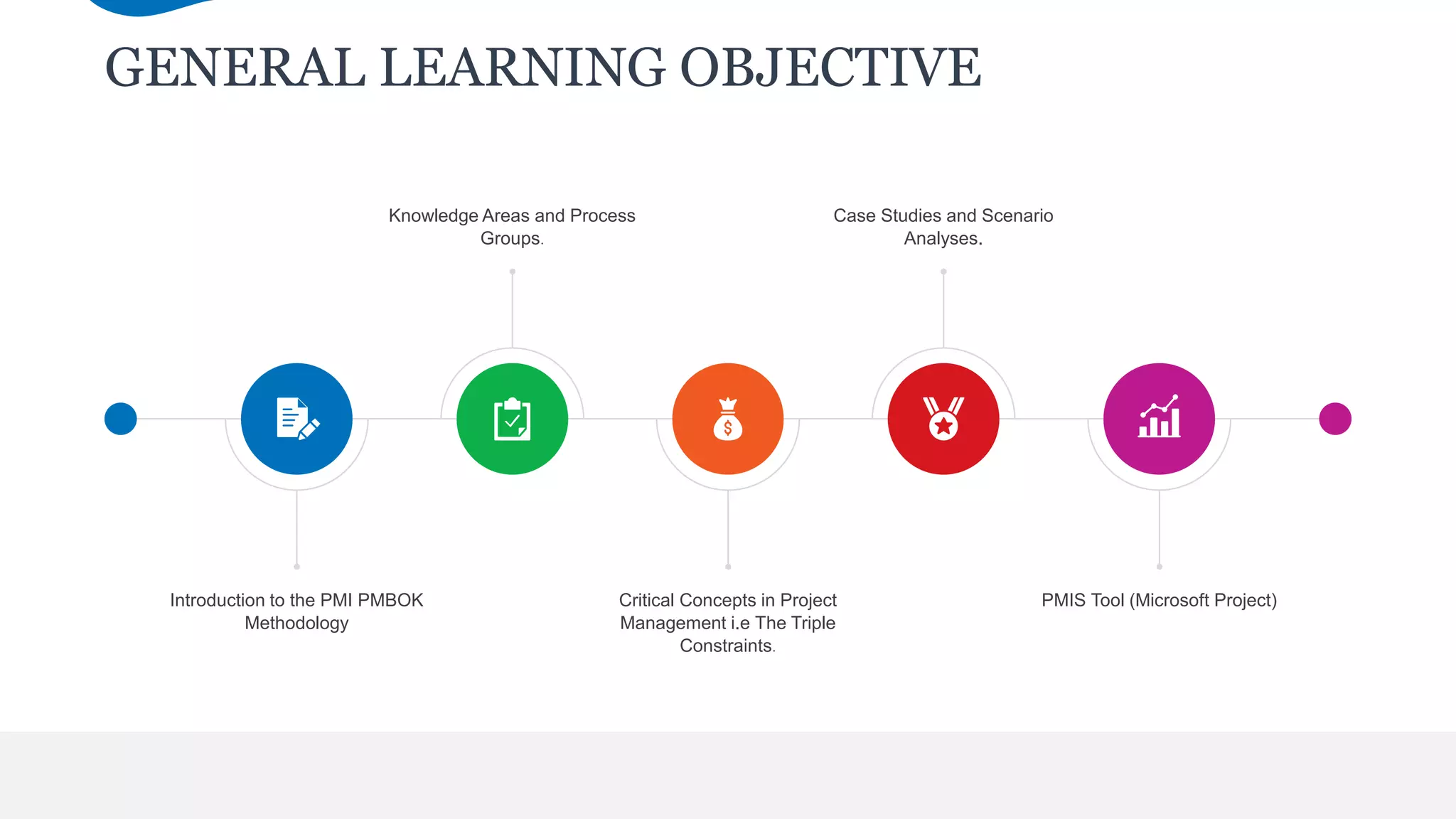This document provides an overview of a project management training module. The module aims to give participants a good understanding of fundamental project management principles and how to apply them to successfully manage projects. Key topics that will be covered include the PMBOK methodology, triple constraints, risk management, scheduling, budgeting, and stakeholder management. The training will teach participants how to develop realistic plans and deliver projects on time and budget. By the end of the module, participants should understand project management best practices and be able to apply the skills and knowledge gained to tasks in their everyday work.