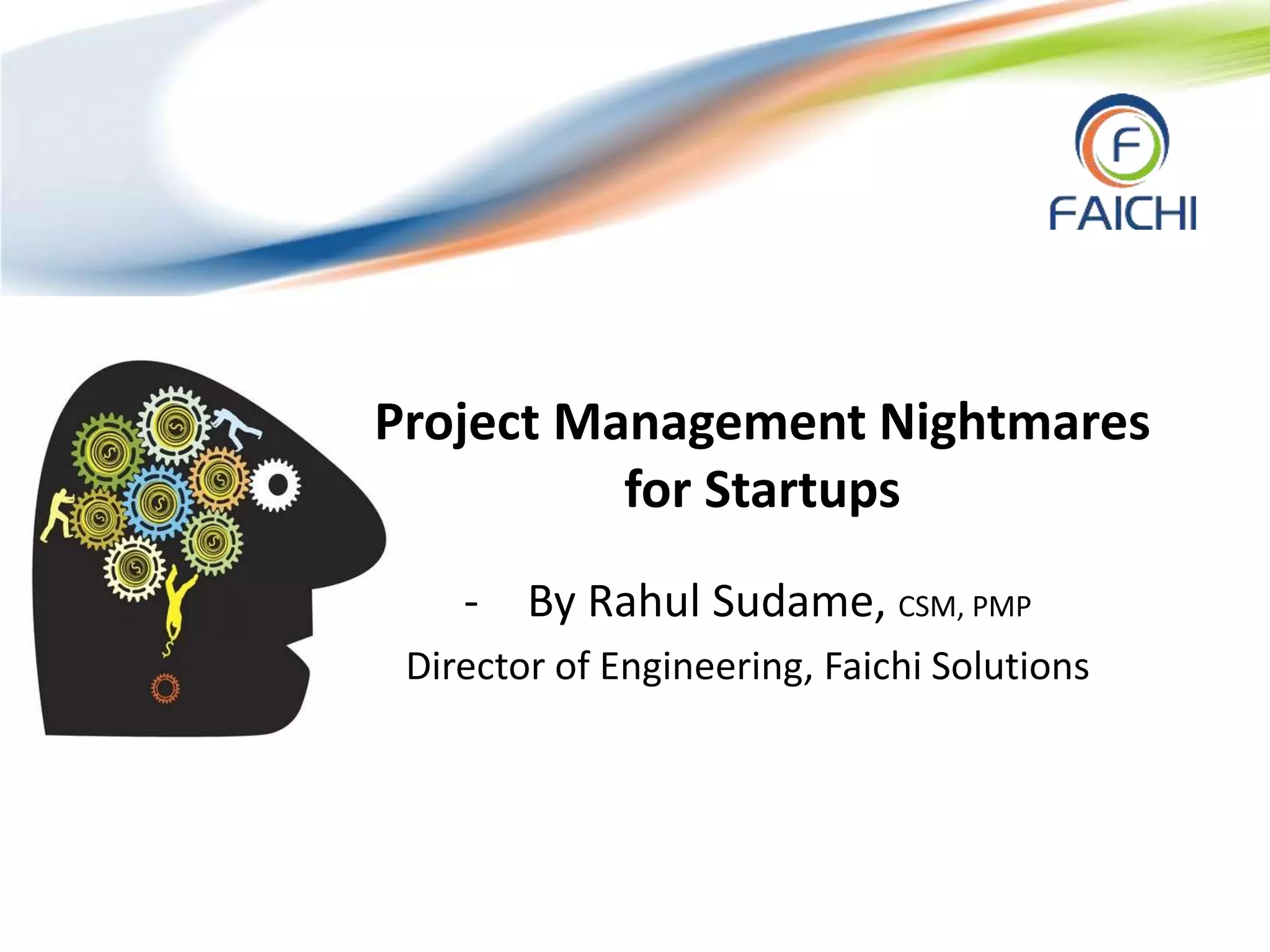 The document discusses challenges of project management for startups. It notes that startups have small teams, evolving product ideas, and changing requirements which make traditional project management approaches like waterfall not work well. It recommends using agile methods like Scrum, maintaining a product backlog of user stories, and collaborating closely with customers for feedback. Both wireframes and close collaboration helped deliver products, while evolving requirements and lack of change control caused issues. Learning included defining core processes, validating ideas with customers, and building what customers need.