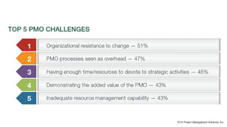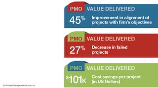 The document discusses Project Management Offices (PMOs). It begins by introducing the author and their background. It then defines a PMO as a management structure that standardizes project governance processes and facilitates resource sharing. PMOs can have different roles including monitoring project performance, developing project management competencies, managing multiple projects, and providing strategic advice. Research on PMOs since 2004 has examined their roles and functions, structural characteristics, and how they can transform organizations. PMOs are still evolving entities whose structure and impact depend on factors like organizational needs, leadership, and change management efforts.