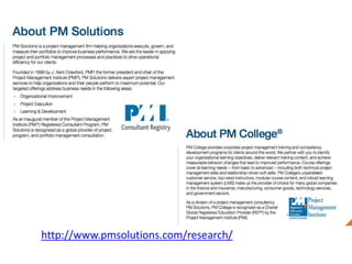 The Project Management Office (PMO) provides resources and research for organizations looking to improve project performance. It offers white papers, case studies, and surveys examining key aspects of project and program management best practices. The website also contains contact information for those interested in learning more about the consulting services available to help companies develop their own in-house PMO functions.