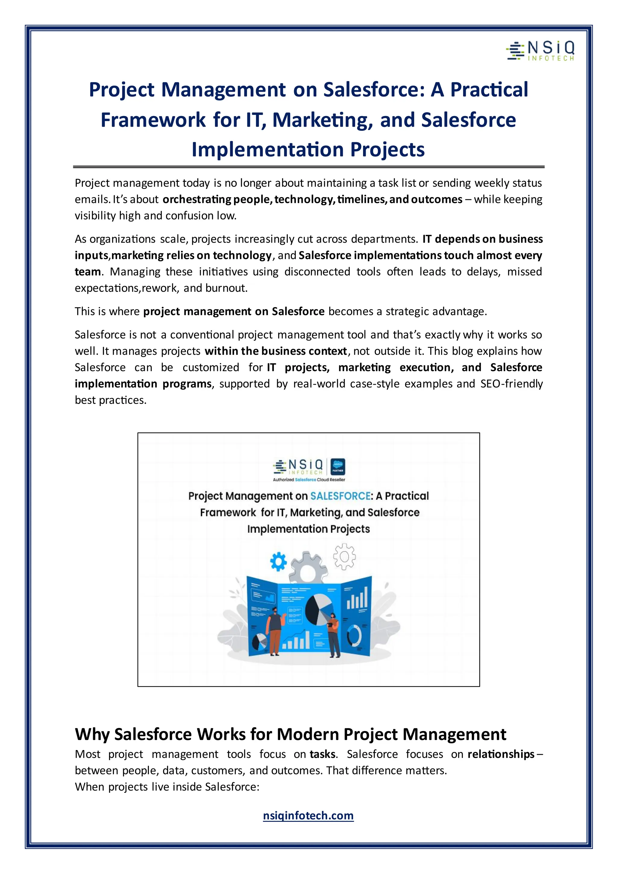 A Salesforce consultant in USA helps organizations manage projects effectively using the Salesforce platform. Project management on Salesforce enables teams to plan tasks, track timelines, allocate resources, and collaborate within a single system. Consultants analyze project requirements, configure Salesforce features, and design workflows that support project execution and monitoring. Dashboards and reports provide real-time insights into progress, risks, and resource utilization. Salesforce-based project management is commonly used for CRM implementations, operational projects, and cross-functional initiatives.