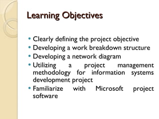 The document discusses planning for an information systems development project. It covers defining project objectives, developing a work breakdown structure and network diagram, and utilizing a project management methodology like the systems development life cycle. Key steps in planning include defining the objective, listing all required activities, and graphically depicting the sequence and relationships of activities in a network diagram using techniques like Gantt charts.