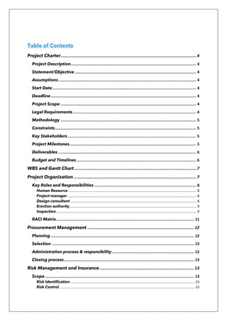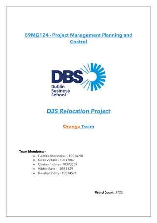The document outlines the project management plan for relocating Dublin Business School (DBS) to a new campus in Blanchardstown, Dublin, emphasizing a comprehensive approach including timelines, budgets, key stakeholders, and methodologies. The project is structured into various milestones and is guided by assumptions regarding legal compliance and budget approval, targeting completion by September 2022. It also details risk management strategies and the organizational structure necessary for successful project execution.