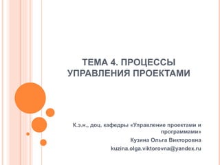 Документ описывает процессы управления проектами, включая их определения, характеристики и различные группы процессов. Он классифицирует процессы на основные, вспомогательные и внешние, и описывает этапы, такие как инициация, планирование, исполнение, мониторинг и контроль, и закрытие проекта. Также рассматриваются инструменты и методы, используемые для управления проектами, а также активы процессов организации.