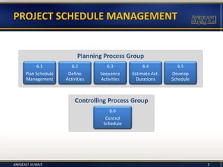The document outlines key processes in project schedule management, emphasizing the development and control of schedules to ensure timely project completion. It details procedures for planning, defining, sequencing activities, estimating durations, developing, and controlling schedules, while also introducing emerging practices such as iterative and on-demand scheduling. Additionally, it describes essential outputs such as the schedule management plan and activity lists, critical for effective project execution and monitoring.