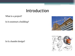 This document provides an overview of project management and the Project Management Professional (PMP) certification. It defines what constitutes a project, describes the five process groups of project management, and explains the project life cycle and management framework. The five process groups are initiating, planning, executing, monitoring and controlling, and closing. Project management balances the triple constraints of scope, time and cost. The document also recommends several books for PMP exam preparation.