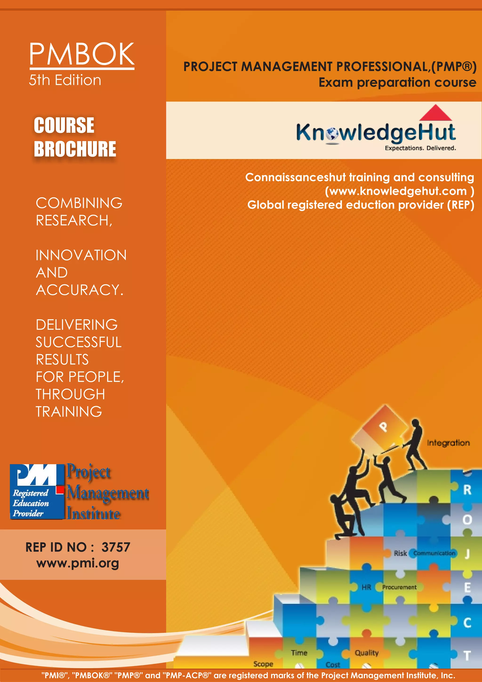 This document provides an overview and agenda for a PMBOK Project Management Professional (PMP) exam preparation course offered by KnowledgeHut Training and Consulting. The 14-unit course covers the PMBOK Guide's 10 knowledge areas and 5 process groups to help students understand the PMP exam format, learn key project management processes, and pass the PMP certification exam. It includes classroom training, a case study, exercises and examples to apply concepts, and sample exam questions to optimize exam preparation. The course aims to provide students with the skills and knowledge needed to become certified as a PMP and to apply project management practices in their careers.