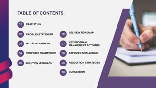 The document outlines an intervention plan for a client aiming to establish a business-driven PMO to address project delays and budget overruns. It highlights existing issues such as ineffective project management support, misalignments with organizational goals, and insufficient stakeholder engagement, while proposing a structured approach to enhance project management skills and methodologies. The plan includes key activities like capability enhancement, resource optimization, and continuous improvement to ensure project success and stakeholder satisfaction.