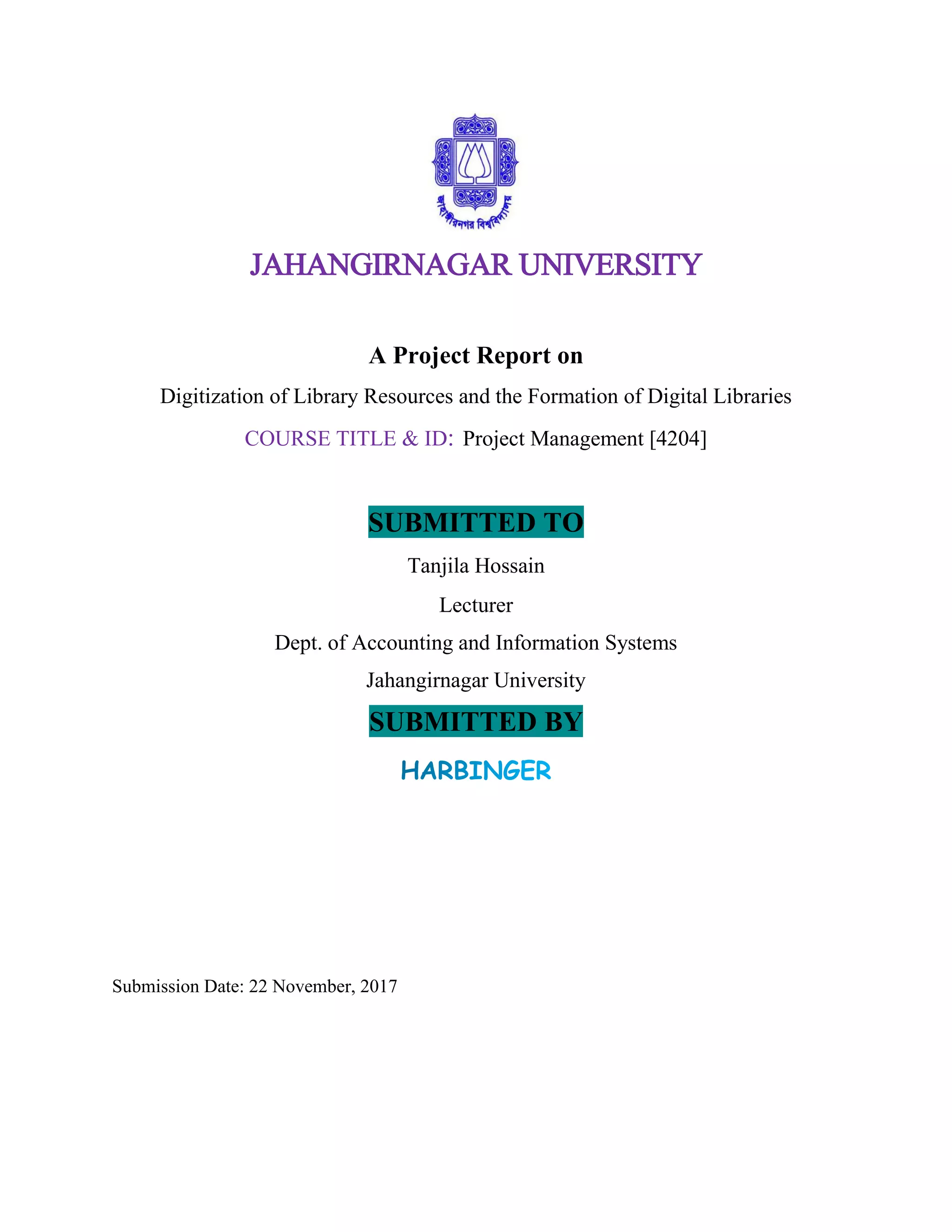 This project report outlines the digitization of library resources and the formation of digital libraries at Jahangirnagar University, detailing its objectives, benefits, and methodology. Key deliverables include improving access, preservation, and usability of documents while addressing limitations like time constraints and technology access. The project emphasizes the importance of planning, implementation, and management to effectively create and maintain digital collections.