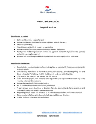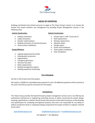 The Folson Group offers project management services focused on construction and energy efficiency projects, including managing contracts, coordinating construction phases, and liaising with contractors and owners. They charge a fee of 15% of the total project cost, with a $3,000 non-refundable down payment required to begin services. It is important to note that they do not provide architectural or engineering consulting services, limiting their role to project management only.