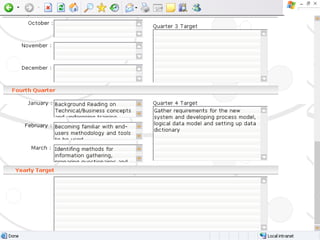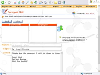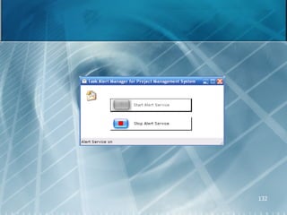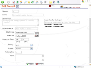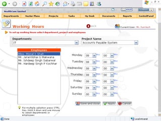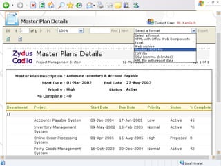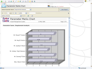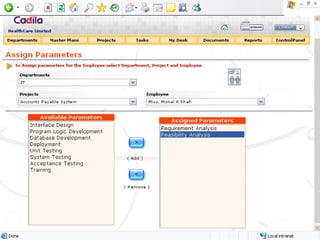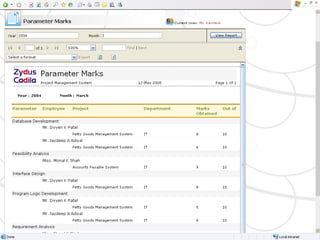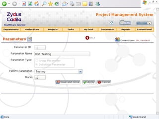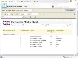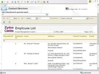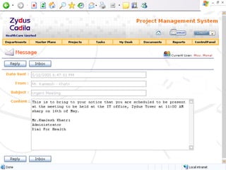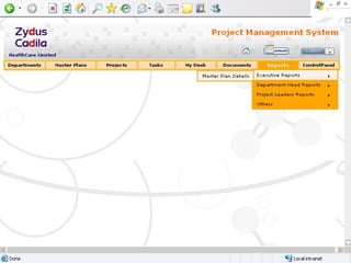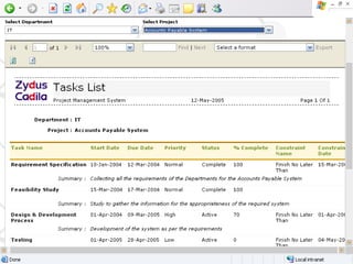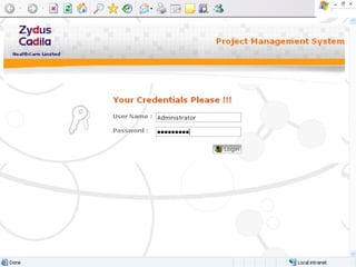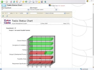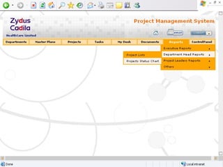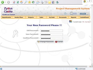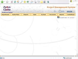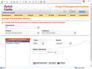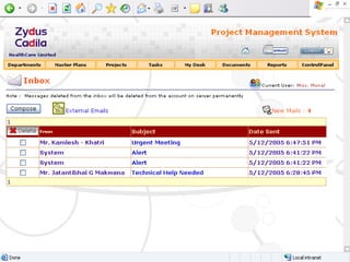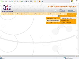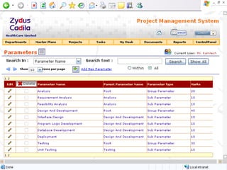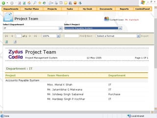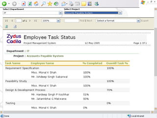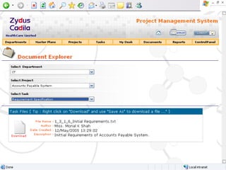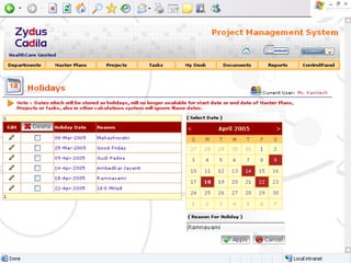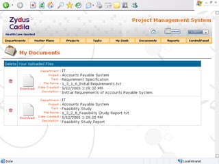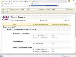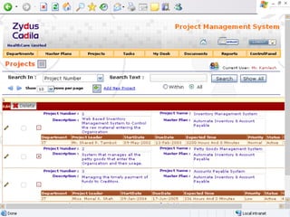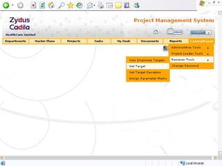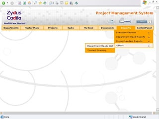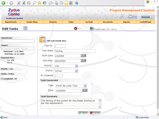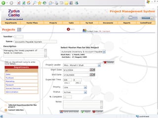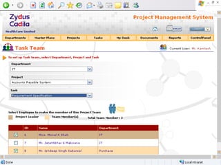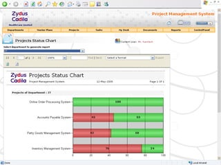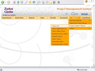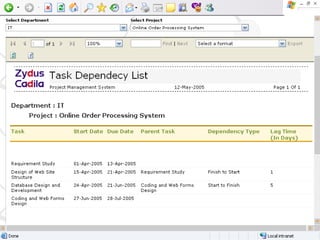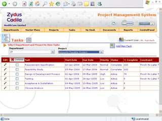 The document summarizes a project management system developed for Zydus Cadila Health Care Ltd. Key features of the system include reflecting accurate project status, easy task dependency definition, customized security, and enhanced communication tools. The system was developed using ASP.NET, C#, VB.NET, and SQL Server. It includes modules for managing departments, employees, projects, tasks, targets, alerts and more. The database was designed with multiple tables to store related data and ensure referential integrity.
