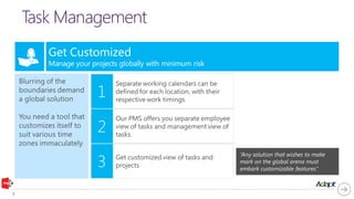 The document describes a SharePoint-based project management system (PMS) tailored for various industries, offering essential features such as planning, scheduling, budgeting, and task management. It highlights functionalities like Gantt charts, reporting, and resource management to enhance project efficiency. Additionally, it mentions a free 30-day trial for users to evaluate the application.