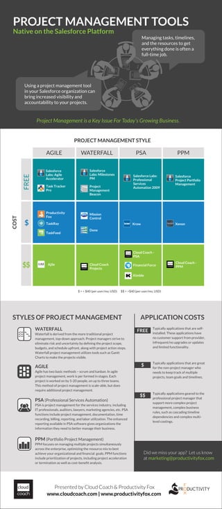 The document discusses different project management styles and tools. It describes Waterfall project management as utilizing a traditional top-down approach to define scope, budgets, and schedules upfront. Agile project management is performed in stages by teams of 5-20 people and can scale to multiple teams. PSA focuses on project management for services industries, while PPM manages multiple projects across an enterprise to optimize resources and goals. The document also provides a table comparing costs of various project management applications.